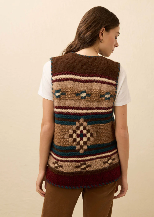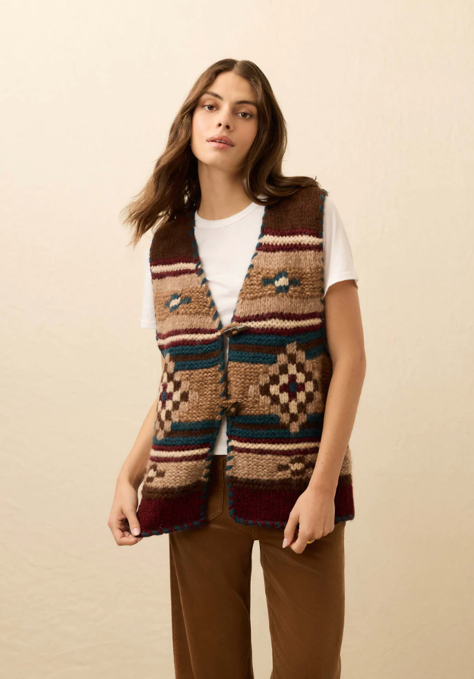 Designed by Native artist Bethany Yellowtail (Crow Nation and Northern Cheyenne), this hand-knit sweater vest highlights traditional motifs through intricate stitch mixing that creates rich texture and dimension. Edged with blanket stitching and finished with a toggle closure at the front, it’s a timeless piece that elevates your wardrobe.