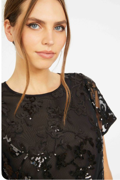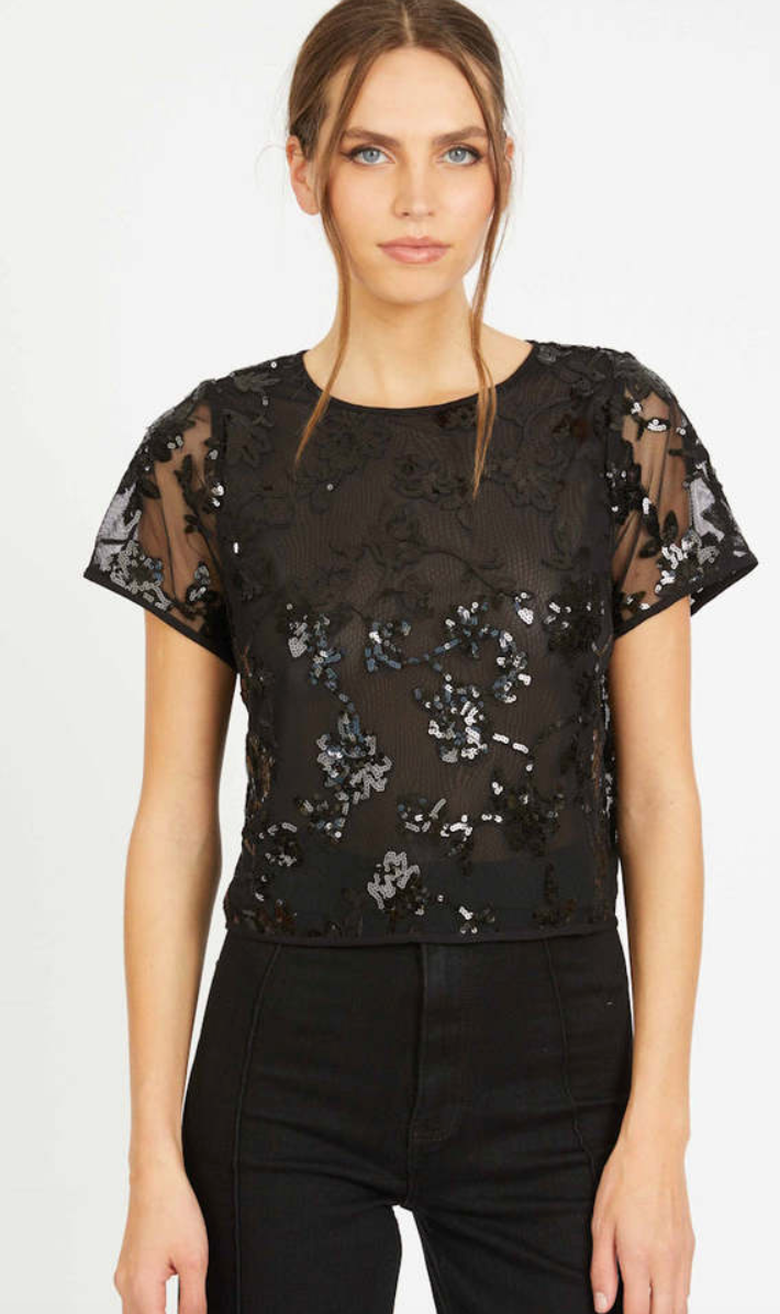 The Carmen Top in black floral sequin lace is a short sleeve, crew neck style designed with a boxy silhouette and bold texture. Featuring floral-inspired sequined embroidery layered over open mesh, this top balances graphic detail with subtle sheerness. Perfect for fall, the deep black hue and shimmering sequins bring a rich, sophisticated feelideal for layering under jackets or pairing with high-waisted trousers. - Short sleeve - Relaxed fit - Back button & loop closure - Black sequin lace Made in USA