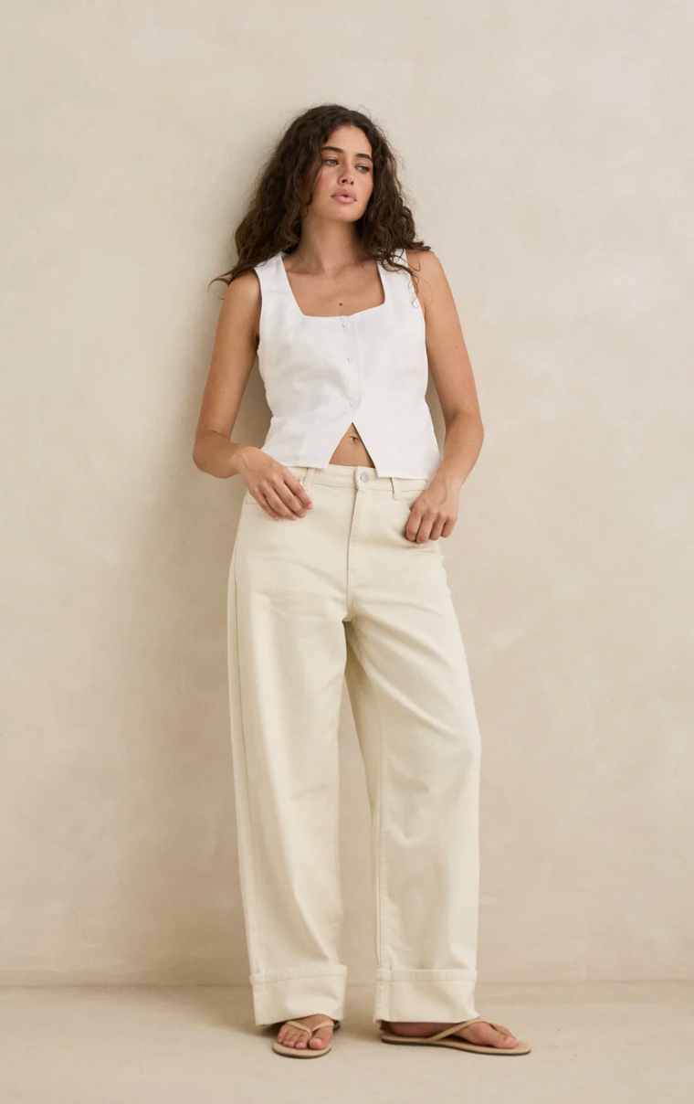 Designed for effortless styling, the Jasper Turnback Pant features a low-rise, slightly oversized silhouette with rounded front pockets, Rhythm-branded metal trims, a button and fly closure, and a turned-back hem.