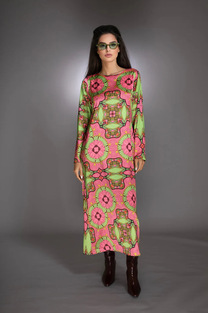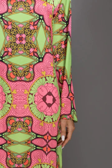 Step into a world where elegance meets enchantment with Nuvula's latest dress. Adorned with a captivating hand-illustrated floral print, rendered in mesmerizing psychedelic artistry, this gown is designed to transport. It features a sophisticated jewel neck, gracefully flowing long sleeves that flare dramatically, and a delicate back keyhole with a hook-and-eye closure for an alluring touch. Lined for seamless wear, this piece is a testament to Nuvula's unique vision, blending artistic depth with undeniable elegance.