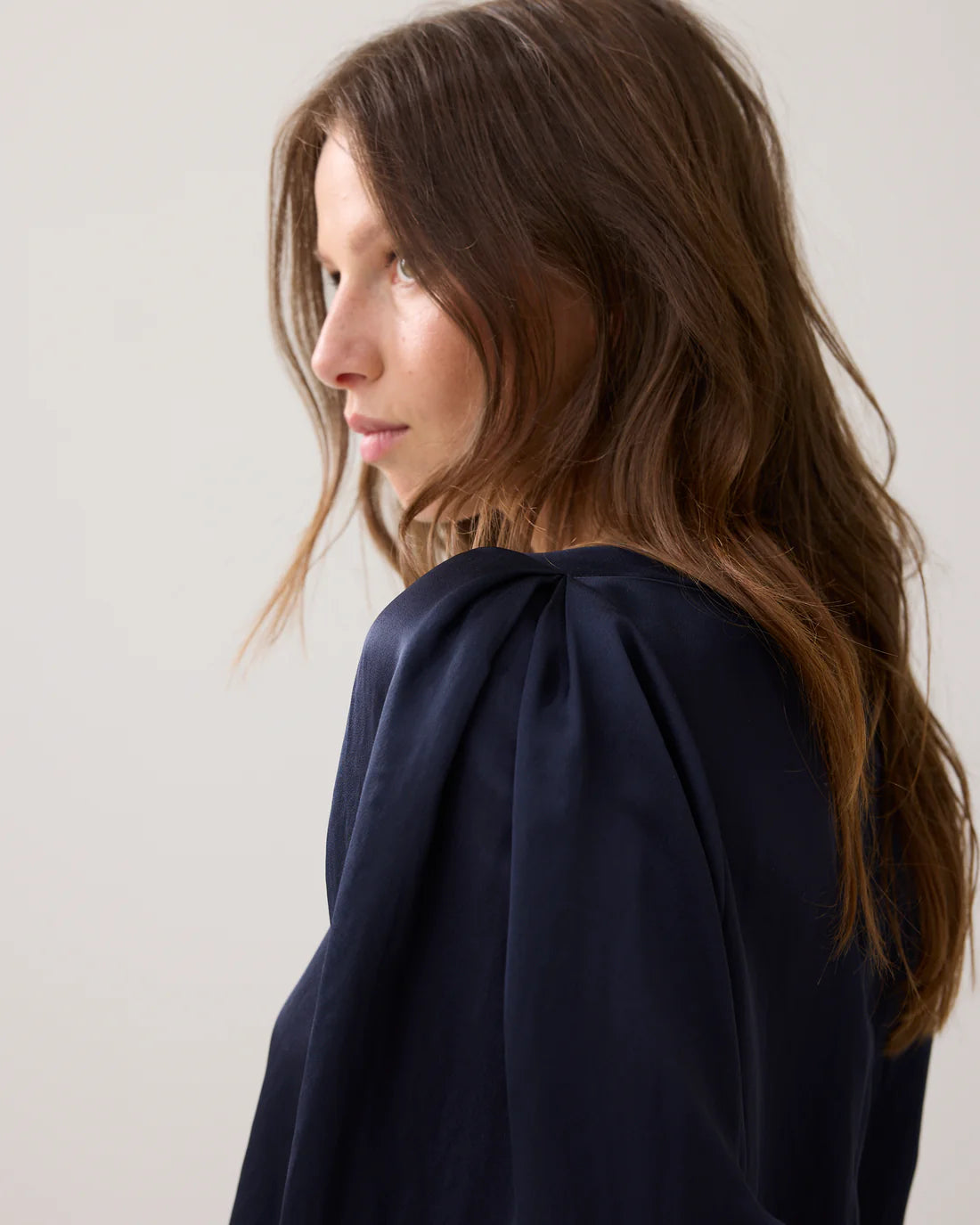 Shiny top in flowy, high-quality fabric with a trimmed V-neck. The wide cuffs and double pleats at the top of the sleeve create an elegant puff sleeve.